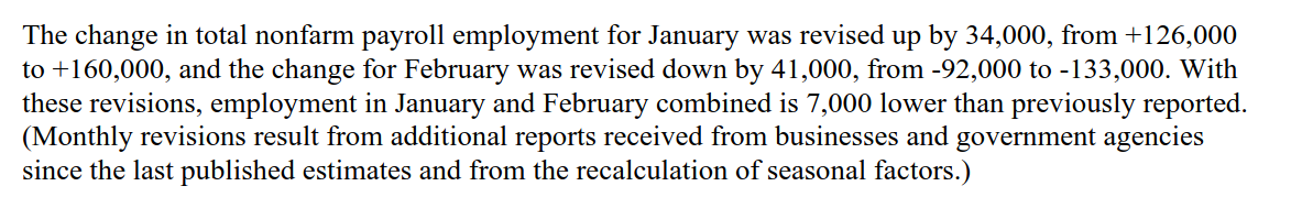 Of course, as we’ve seen, the jobs report can be subject to a lot of revisions. A quick scan down indicates the revisions for January were a +27% change, while February a -45% change. Which is actually the opposite I would have expected, with large deviations from the mean pulling back to the mean as more data comes in. This means, until March is revised, we stand a net 171,000 non-farm payrolls for the year. Meaning we created just under 60,000 jobs a month. If we had a normal influx of immigrants increasing the population (many arriving already working age), that would be medium bad. But with no population growth, it’s likely a good number. Prior to the current hell-scape, we needed 100,000 to 150,000 jobs a month to absorb new entrants.