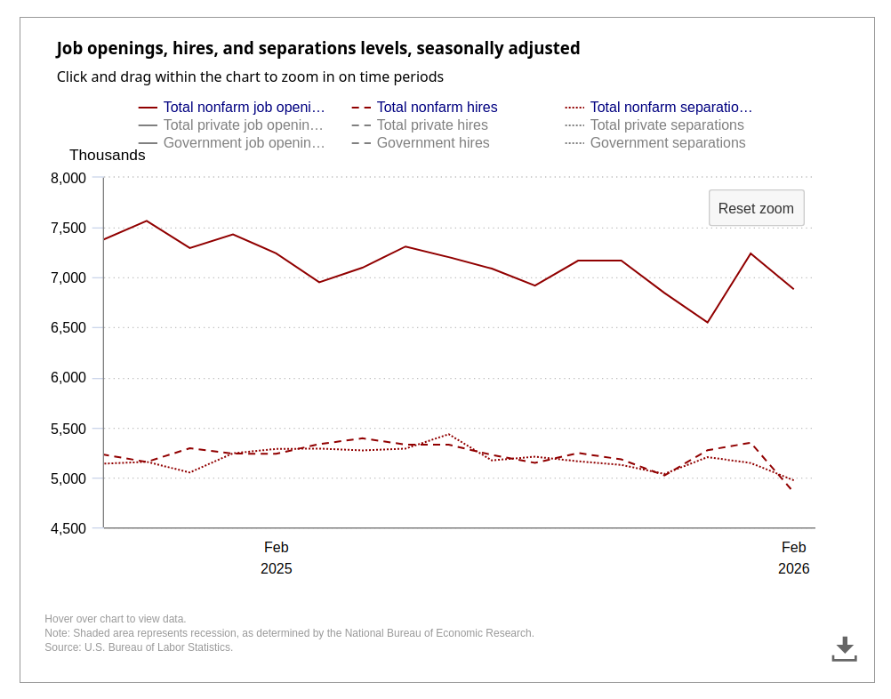 To get some context around the jobs report, let’s look at JOLTS, which only covers up to February (jobs data covers March). We see, in fact, February was a rough time. With openings, quits, and hires, all trending down, indicating it’s harder to lose a job and harder to find a job. This is in line with anecdotal stories about businesses being slow to fire (after spending months unable to hire just a couple of years ago). And in line with job seekers, especially new job seekers, finding limited opportunities.