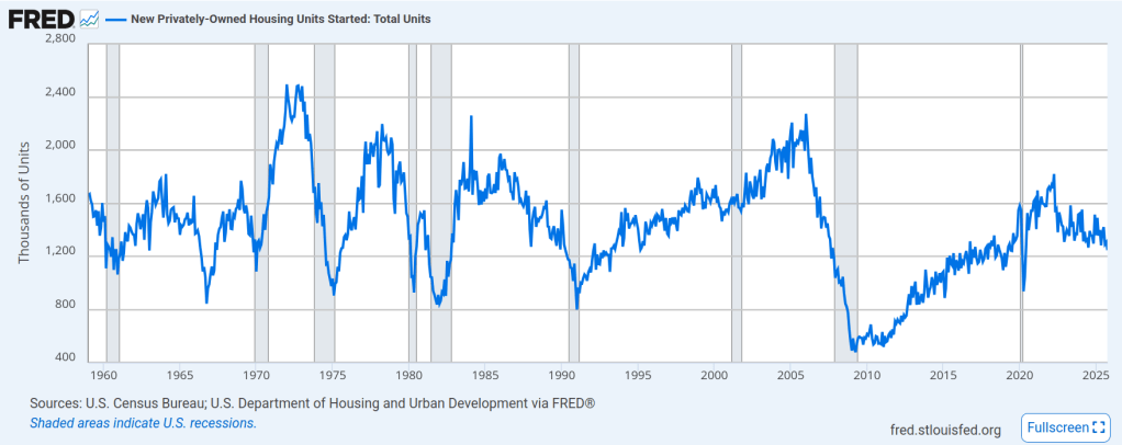 Which brings me to this graph, the balance of payments (trade deficit). If you eye-ball a line across the graph, between -60,000 and -80,000, you probably have close to the average trade deficit. Then you have “Liberation Day” in April and a huge spike. What’s that about? Those are businesses bringing in inventory prior to the tariffs taking effect. That inventory was spent down in the next few months, as businesses imported less because their inputs were sitting in warehouses. At some point they are going to have to bring in more product, and that’s why I think we’ll be back to roughly the same (maybe a hair smaller) trade deficit. We’ll have to see how it plays out, but the last reading was in line with the historical average.