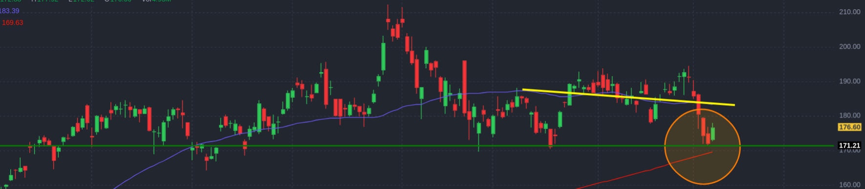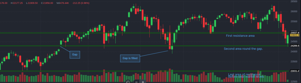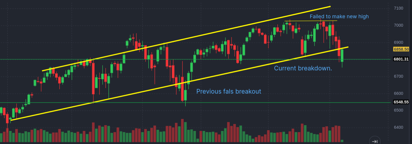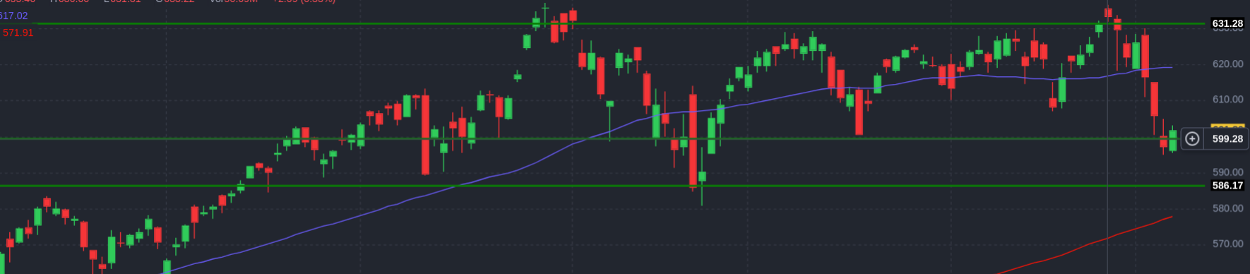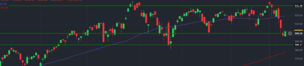 This is the “cash” index ($SPY) for the S&P 500. That’s different from the index that most people look at, which is actually the price of a futures contract on the S&P 500. The price action is a little different, but not radically different. But the S&P 500 that everyone talks about in the news is actually an expectation of the S&P 500 price in the very near future, traded almost continuously. So there are fewer gaps in the price action. The cash index primarily trades during normal trading hours in the US. The chart below is the futures contract and is smoother, with fewer gaps, but it’s basically the same movement.